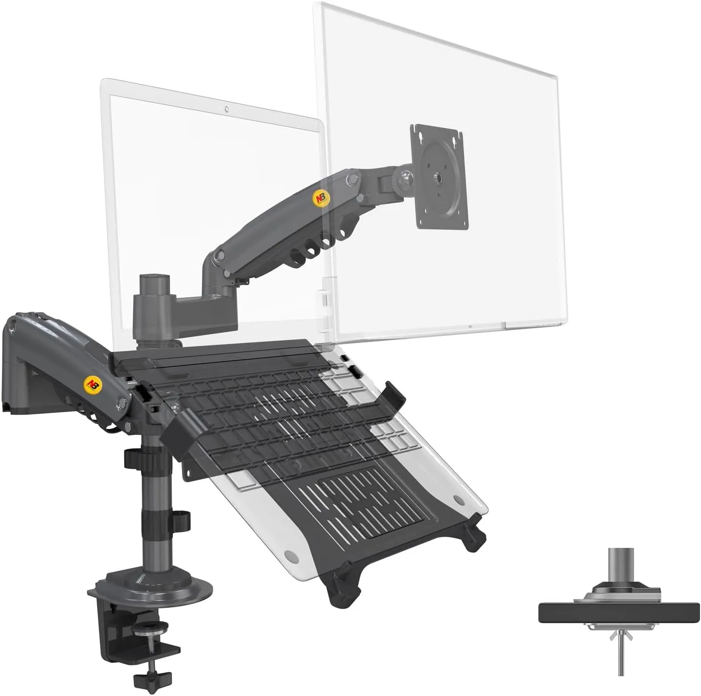 - Compatibility of Laptop MountWith loading capacity of 26.4lbs(12kg) for each arm. One arm can hold laptops from 10-17, Another arm fit most monitors from 22-35 (VESA 75x75mm or 100x100mm). The 2 VESA mounts and 1 laptop tray allow using laptop and monitor at the same time without switching screens. The venting holes on laptop tray can prevent your laptop from overheating.