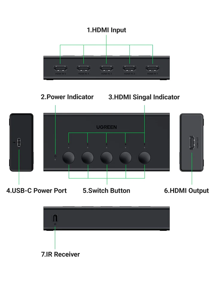 - Designed for Multiple Gaming Consoles: Are you tired of constantly switching among multiple gaming devices on your TV? UGREEN HDMI Switch 5 in 1 out makes it a breeze! Connect 5 of your favorite gaming devices such as PS5, Xbox, Switch, Roku, and laptop to your TV with just one input port