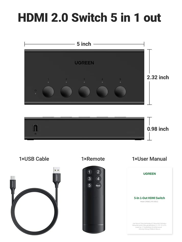 UGREEN 90512 HDMI SWITCH 5 IN 1 OUT 4K60HZ WITH REMOTE
