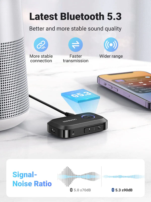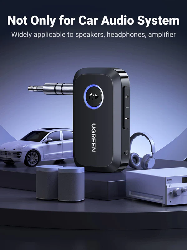 • Bluetooth 5.3: UGREEN Bluetooth aux receiver car uses the latest Bluetooth 5.3 technology, with a super strong signal and a more stable connection.